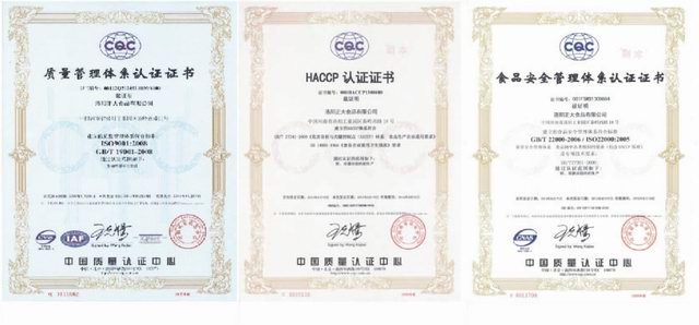 2013年8月19日,公司正式獲得食品安全管理、HACCP管理體系兩個管理體系的認證證書。公司自2012年11月18日開業以來,在全體干部員工齊心協力基礎上,已成功通過了質量管理體系、食品安全管理體系、HACCP管理體系三個管理體系認證,為產品在全國各地市場準入、出口備案及管理水平提升奠定了基礎。